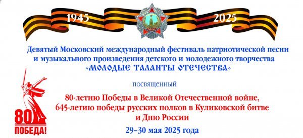 В рамках проведения девятого Международного фестиваля «Молодые таланты отечества», посвященного 80-летию Победы в Великой Отечественной войне, 645-летию победы русских полков в Куликовской битве и Дню России, проводится конкурс патриотической песни, в котором могут принять участие отдельные исполнители в возрасте от 7 до 24 лет и ансамбли. Отбор кандидатов и определение победителей проводится профессиональным жюри. Заявки на участие в конкурсе принимаются до 11 апреля 2025 года (с подробной информацией можно ознакомится на интернет-странице www.rusol.ru).
